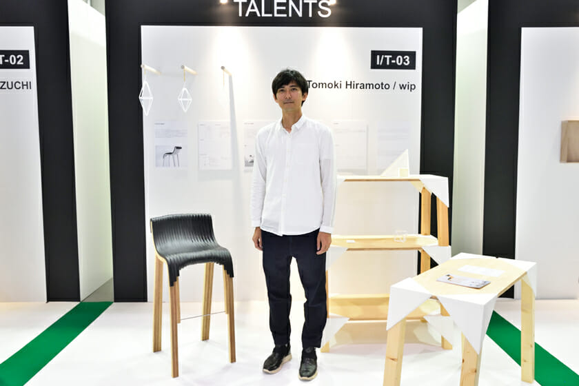 デジタルファブリケーション技術を活用し、建築からプロダクトまでスケールを横断したデザインを行っている平本知樹さん。今回発表したのは、1枚の板からつくられた椅子「From a sheet」のほか2種類。「From a sheet」は、座った時に包み込まれるような座りやすさと、パッと立ち上がりやすい形状につくられている。