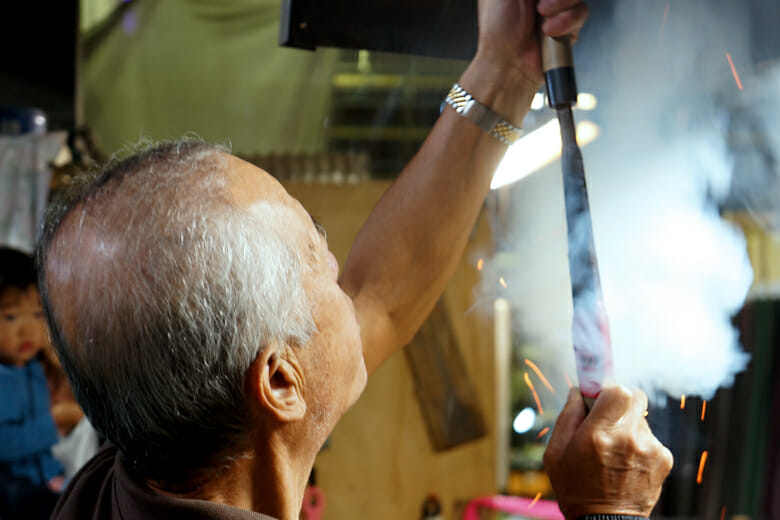 柄入れという、刃と持つ部分になる柄を合わせる工程。取材時に柄入れをおこなっていたのは、2代目の曽根忠一郎さん。迷いなく木槌を振る様子はとてもかっこいい…!