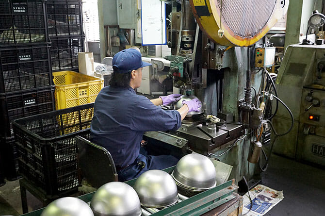 日本洋食器にて、一回目のプレスでボールの形状を作る