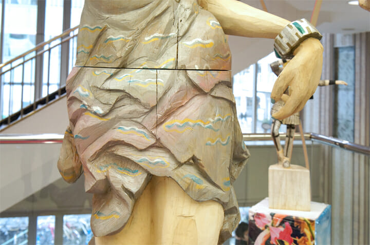 20世紀初頭にフランスで活躍した女性画家、タマラ・ド・レンピッカからインスピレーションを得た木彫作品。立ち姿の女性像を中心に、さまざまなファッションに身をつつんだ女性像がはなやかに空間を飾ります。男性中心の美術界で、タマラ・ド・レンピッカは持ち前の美貌と人間性の魅力によって社交界に君臨しました。その強い女性像は、現代の日本社会を生きる力強い女性たちの姿に重なります。