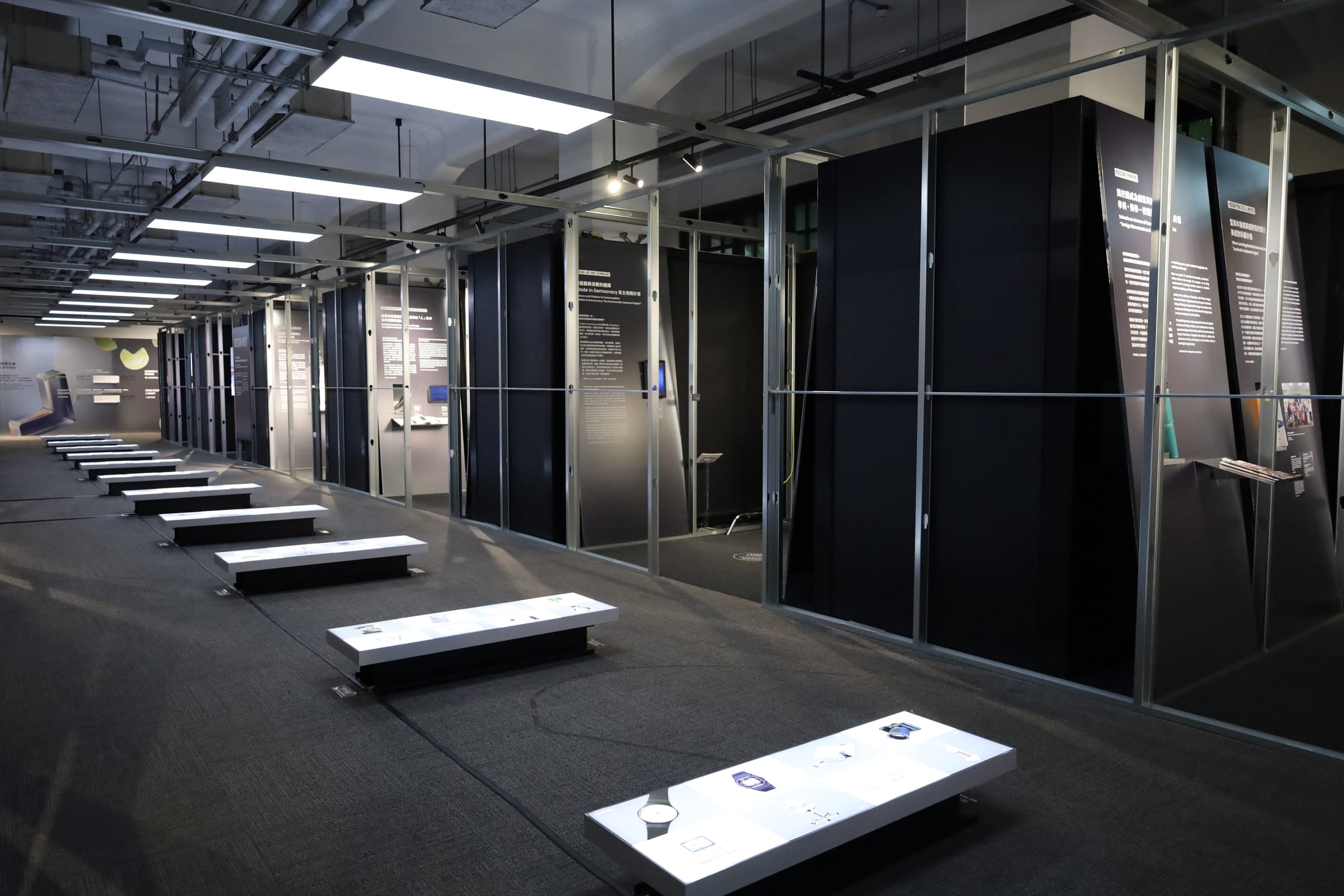 通路の両側に展示室が並ぶ。中央に設置された光のパネルには、時代を象徴する世界的なデザインの数々が並ぶ