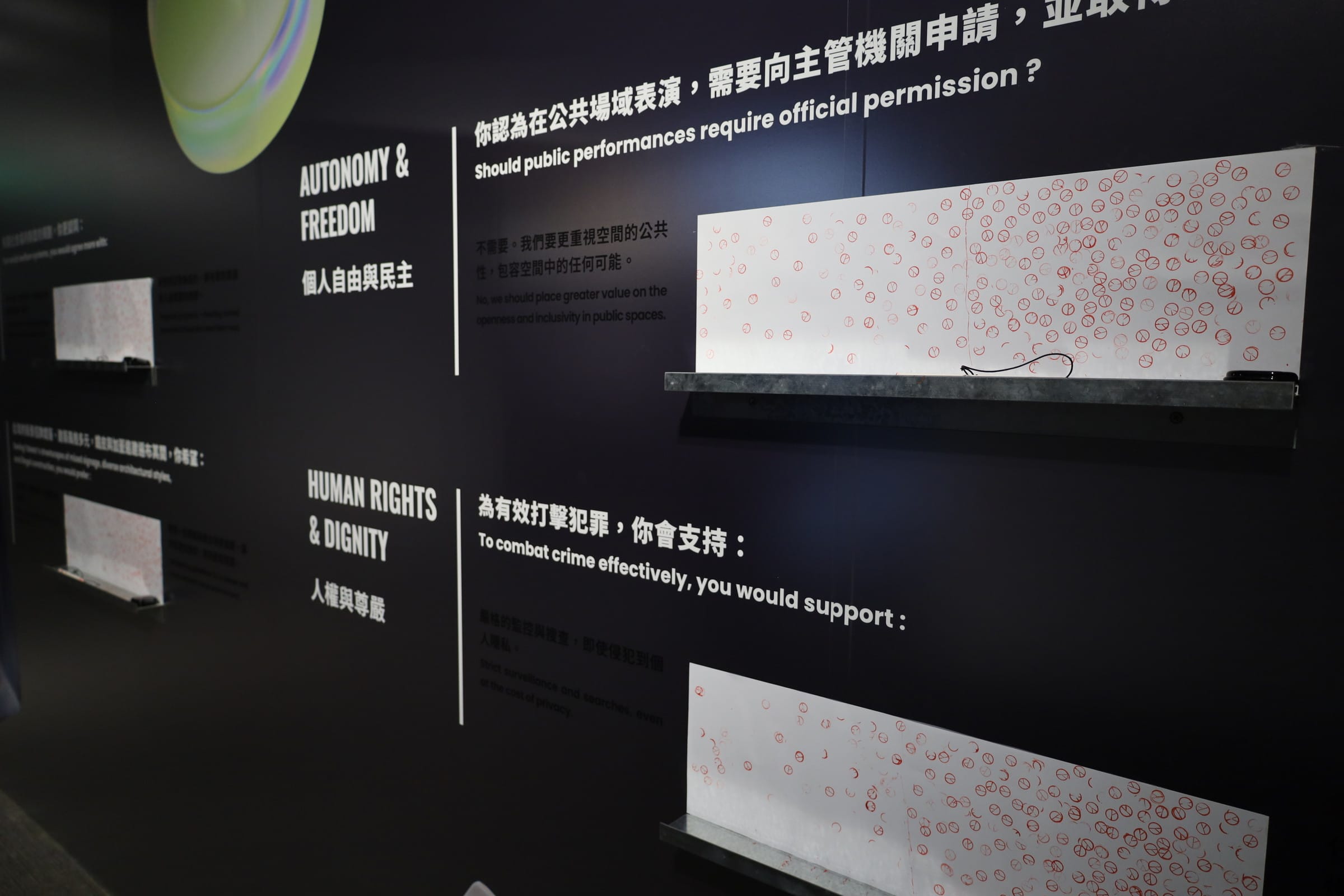 会場の出口近くの壁には、今日において特に重要とされる価値観―自由や平等、民主主義にまつわる疑問が提示されていた。来場者はここで、台湾の選挙で用いられるのと同じスタンプで意見を表明することができる。