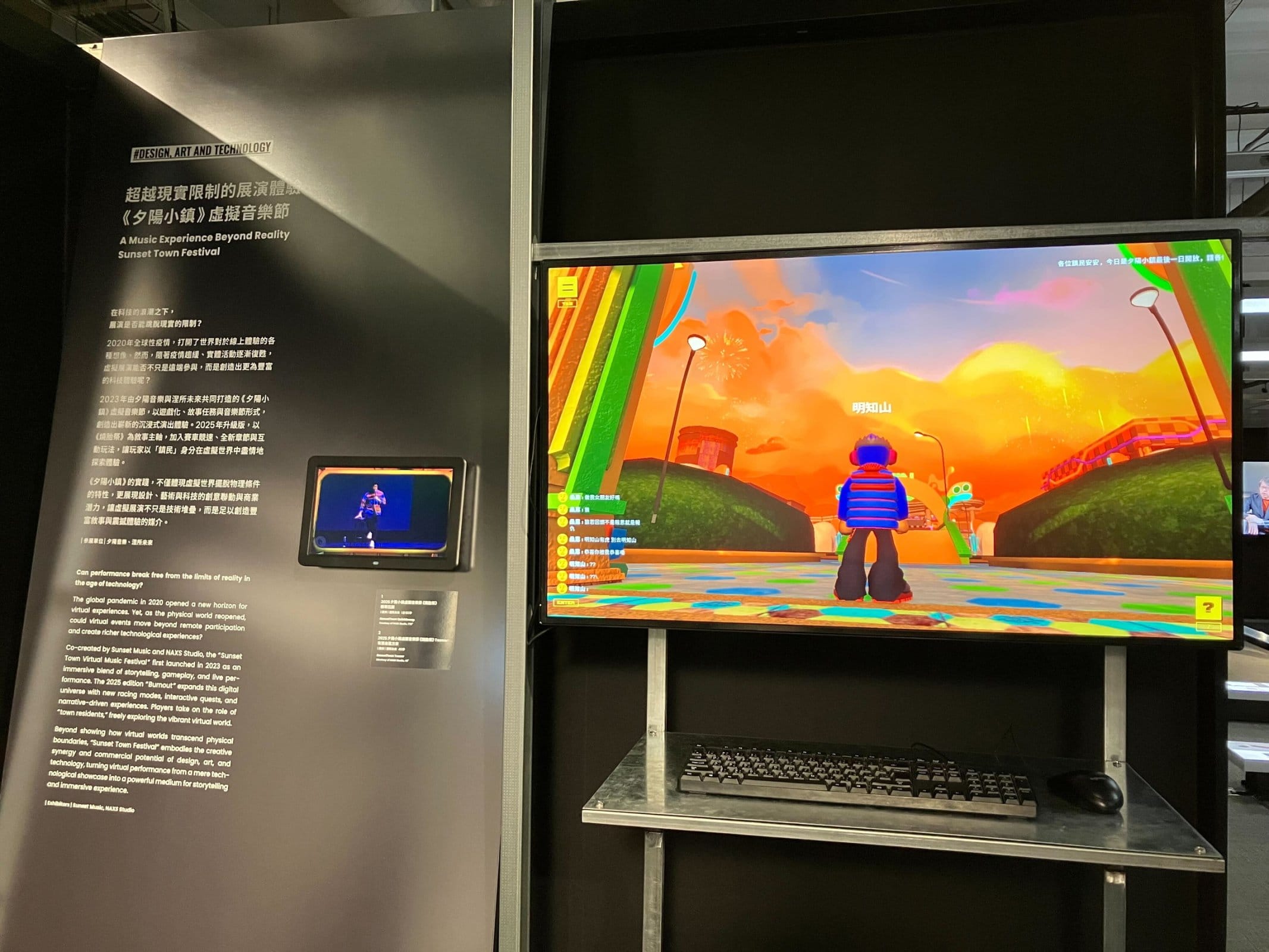 コロナ禍に開発されたゲームの展示。外出を控える人々がゲーム上の町「Sunset Town」に集まり、人気ミュージシャンのコンサートに参加した。展示では、物理的条件から解放されるというバーチャル世界の特性だけでなく、デザイン・アート・テクノロジーの創造的な相乗効果と商業的可能性を示したものとして紹介された