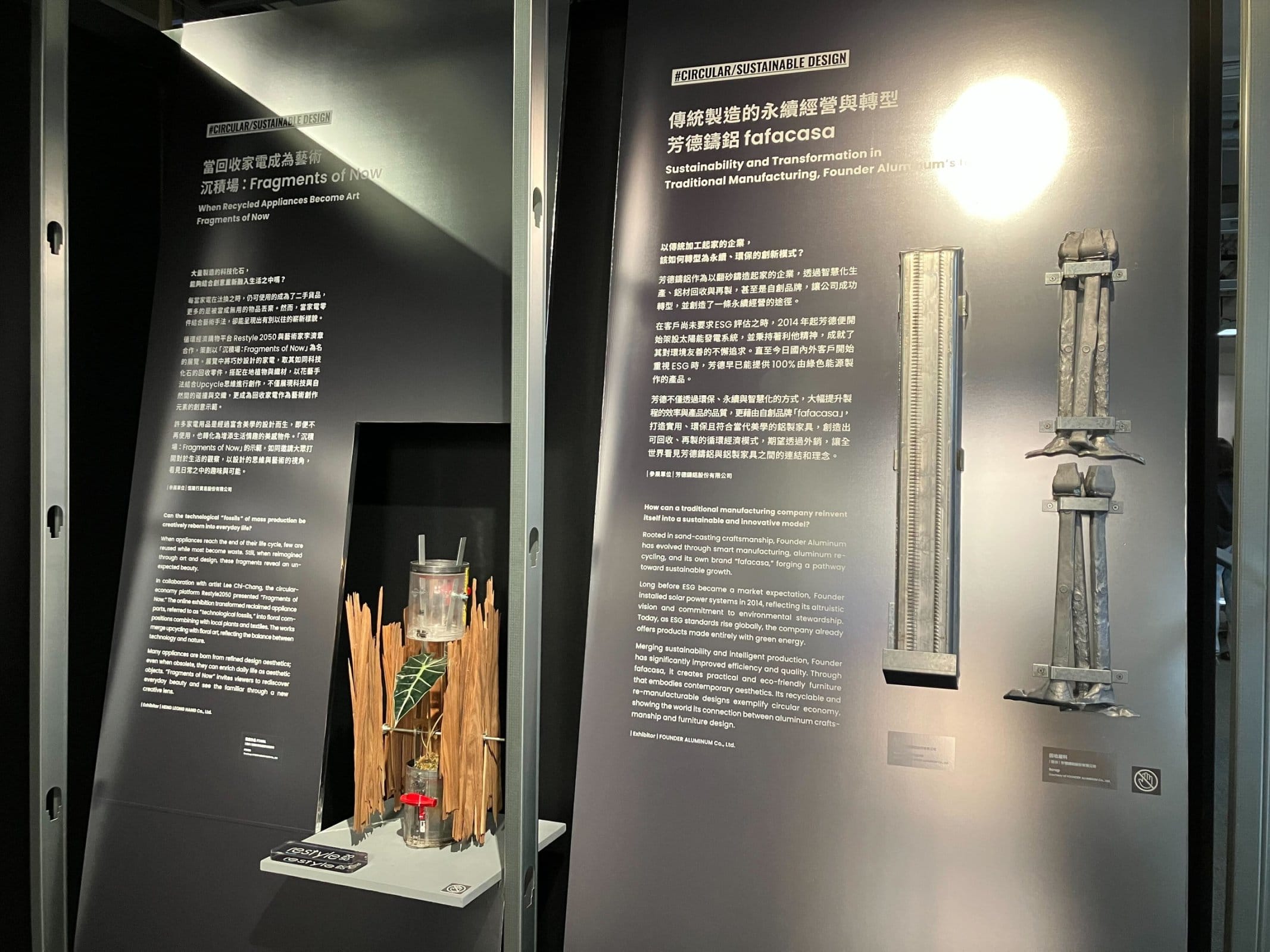 (左)Restyle2050×Lee Chi-Changの作品。(右)リサイクル可能なアルミニウム製の家具ブランド「fafacasa」の展示