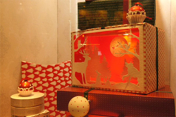 クリスマスイブの夜、子ども達は、サンタクロースのプレゼントを心待ちにしながら眠りにつくことだろう。高く積み上げられたプレゼントの中には、サンタクロースを巡る様々なドラマが詰め込まれている。それは、子ども達の夢の1コマなのかもしれない。箱の中にLEDを仕込み、ペーパークラフトであたたかな世界観を表現した。 (ディスプレイデザイナー 持木慎子)