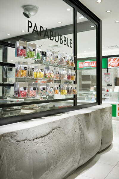 高い技術とデザイン力を持つPAPABUBBLEブランドを明確に打ち出すことを目指した。PAPABUBBLEの飴を改めて見ると味はもちろん、「どうしてこんな精巧な模様が連続に出来るのだろう?」と感心させられる。我々はその妙技を余すことなく、お客様に見て感動していただくため、砂糖を溶かすところから、模様を作る過程、カット、梱包、販売までをすべてひとつながりに見せられるカウンターをデザインした。