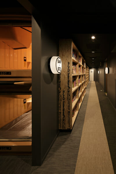 コミックや雑誌、インターネットPCだけでなく、シャワーブースや女性専用パウダーブースなども充実しているため、宿泊施設としての設備もしっかりと対応している。今までの少し不健康なネットカフェのイメージを払拭するデザインにした。