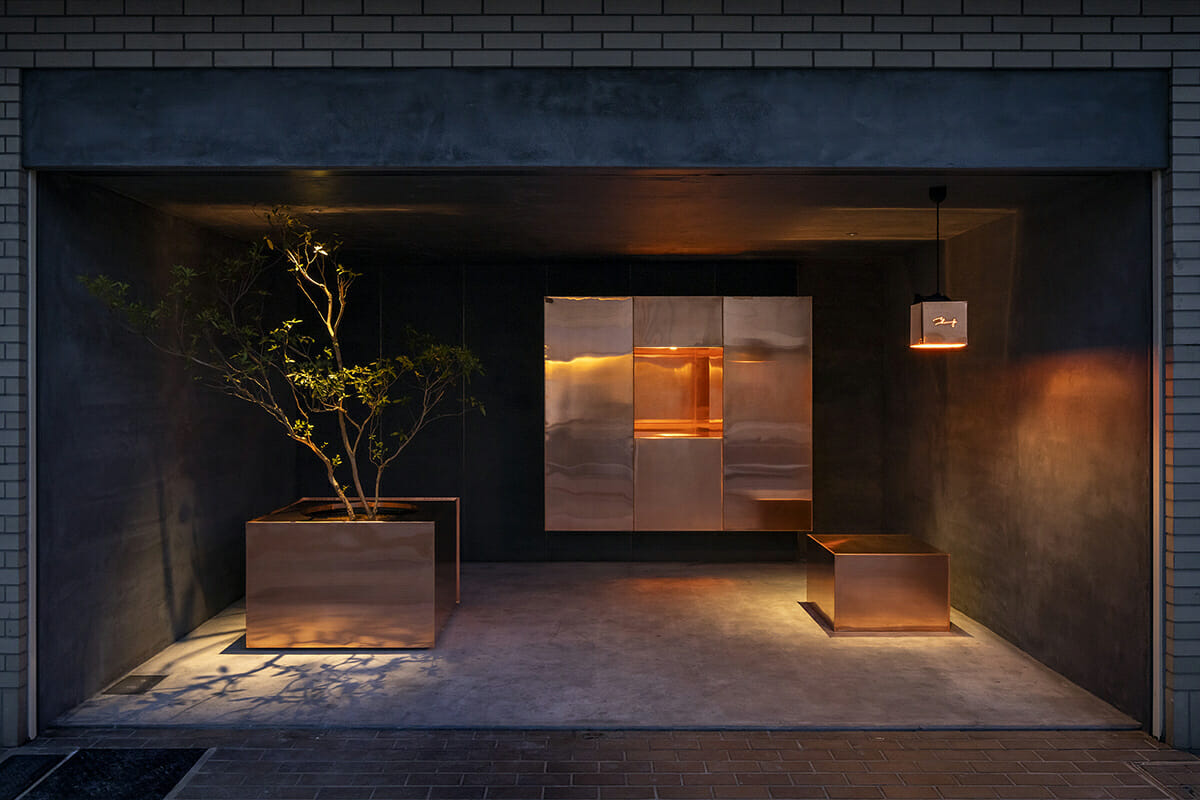 商品の受け渡し口は、銅板の反射を利用して内側から柔らかな光を放つことで、壁に浮かぶ銅板のキューブの中に立つスタッフと、商品へ自然と目がいくようにライティングを工夫しました。日没後には自然光の光とはまた違った表情を浮かび上がらせます。