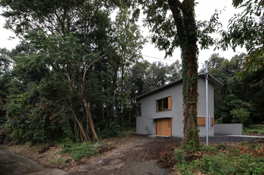まず、螺旋階段を中心にシンメトリーの柱架構と、各面で統一した開口部をもつ単純な矩形を敷地中央付近に配置し、自然の中に建築の領域を設定した。高さ方向は周囲の樹木に呼応するよう最高高さを7mとし、1階天井高を抑えて2階の気積を確保しつつ、3方向の開口部によって森との距離を近づけた。壁は砂漆喰によって架構を覆い塗り込めることで、 建築自体が敷地の中の雑多なものを視覚的に切り取る背景となる。シンメトリーで単純な柱スパンから成る骨格に対し、皮膚のような表層をかたちづくる壁のシークエンスと光の陰影が、自然の秩序を踏襲し、奥行きのある空間となることを考えた。