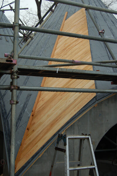 敷地は静岡県伊豆高原の丘陵地で、20m級のケヤキが林立している。以前に建てられた家の尾根の頂部は削り取られていた。ケヤキたちと呼応し、尾根の頂部を彷彿とさせるような建物の設計を試みた。