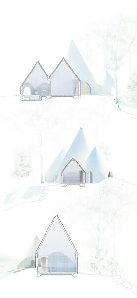外壁、屋根は檜の板張りで、時とともに変化していく。20年後には2人は東の棟に移る。西の棟には次世代を受け入れ、介護する側からされる側とまわり、そしてここで看取られ、そして次世代が引き継ぐ。時とともに循環し移り変わる空間を目指した。