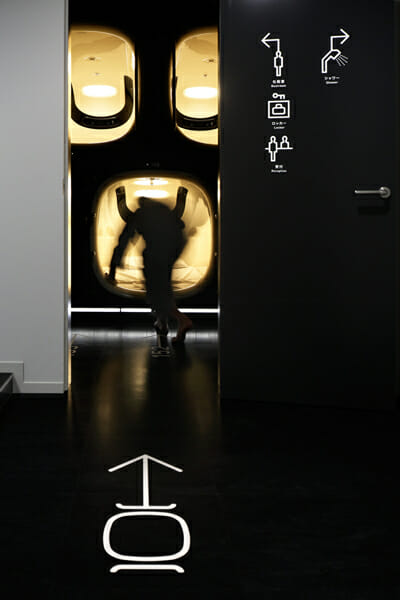 ナインアワーズ成田空港は、京都に次いでオープンした2号店である。「汗を洗い流す・眠る・身支度をする」を3つの基本行動とし、この3つの行為を時間に置き換え、1h(汗を洗い流す)+7h(眠る)+1h(身支度)=9hで「ナインアワーズ」とした。