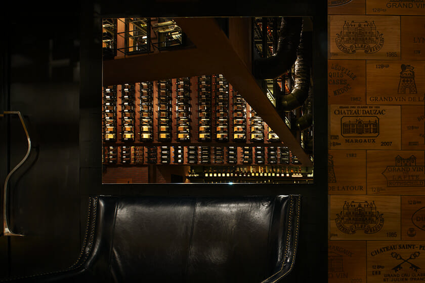 内装はレンガタイル、古材、ワインの木箱といった建材を用いた、よく連想されがちな「小洒落たワインセラーのノスタルジックな情景」を意図的に演出している。ワインセラーにおけるワインラックとは、美しい風景の中によくある「中心的要素」だが、実はそこに最も必要なワインラックは配置されておらず、暗く静かな場所に整然と吊られ、別世界をつくり出している。床に置かれて整然と並ぶワインラックとワインボトルによる情景が、人々に重厚感のある落ち着いた印象を与えるのに対し、それを反転させて上部から吊り上げたことや従来のワインセラー的世界から取り出して、別世界をその上部につくり出したことで、訪れた人々にこれまでの経験にはない不思議な感覚を与えることができる。