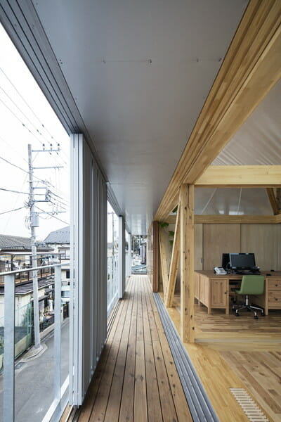道路面に対する視線の制御と東面の横からの日射に対する遮蔽のために、屋外建具は東面の朝日に対して開口率を約30%に設定し、縦格子を幅42mmで角度60°、幅80mmで角度70°、幅120mmで角度80°の3つの部材配置の組み合わせで3種類設計した。東面と北面に対してそれぞれ縦格子の向きが変わり、敷地状況に合わせた視線制御と環境条件に合わせた日射制御にそれぞれ対応している。庇上部の欄間部分のアルミサッシは一部開放可能になっている。