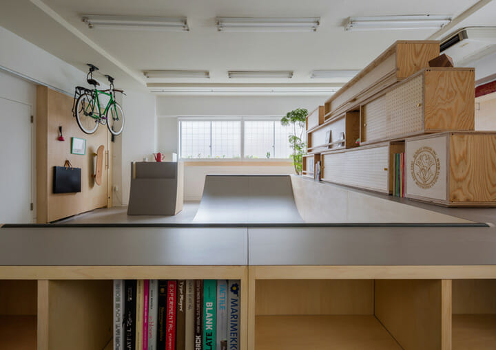 スケートランプの製作は普段プロダクトを作っている「riceproduct」に依頼し、メラミン仕上げとし、家具製作の精度とディテールで作り上げた。スケートランプでもある棚は本棚や植物の鉢として機能するが、打ち合わせスペースと作業スペースとの目隠しも兼ねている。窓にはスケートボード対策の柵を設置し、そのバッファー部分には植物を植えた。