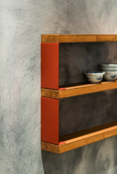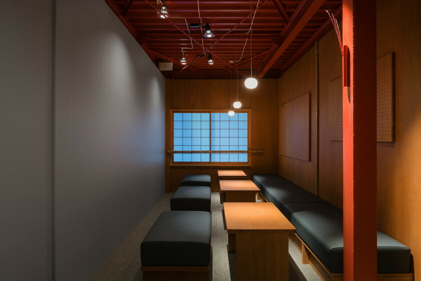 屋内に入ると露骨なスケルトンに、錆止めの赤いペイントが塗られた梁や柱天井のデッキプレートが目に入ります。単なる機能としか認識できないものが、色自体に変化を加えずとも、“寿司” という用途を取得することで、錆止めの赤から、和の(赤)朱色へともう一つの顔へと変化を遂げることに気づきました。先入観と固定概念をうまく利用し、イメージのみをコントロールすることで、既存機能に形ないしつらえが担保されました。つまり 、“意識のデザイン”ということになります。