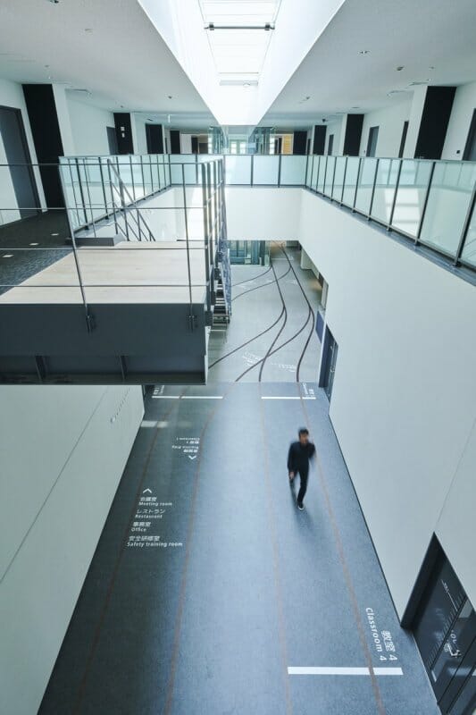 研修生がおもに使用する教室などがエレベーターや階段の奥に配置されていたこと、幅員が狭い通路により廊下の奥の部屋が視認しにくいといった空間的な問題がありました。そこから、サインデザインで視認しにくい部屋へどのような手法で人を導くかがデザインにおける課題となりました。