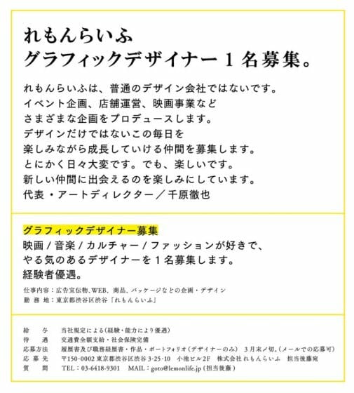 【求人情報】アートディレクター千原徹也率いる、株式会社れもんらいふがグラフィックデザイナーを募集